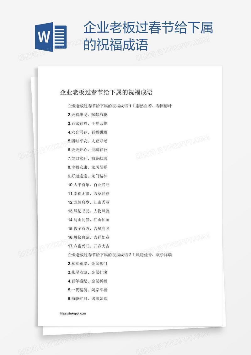 本作品为企业老板过春节给下属的祝福成语, 编号:o12yp5ko49, 格式为 docx, 大小1 MB, 本作品下载后,先解压,解压之后用推荐软件 Word(2010) 打开, 然后进行编辑功能。