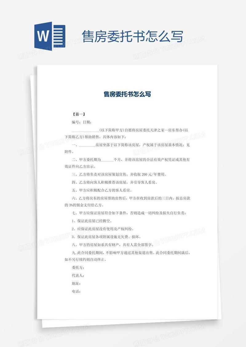 本作品为售房委托书怎么写, 编号:o12ypno0j9, 格式为 docx, 大小1 MB, 本作品下载后,先解压,解压之后用推荐软件 Word(2010) 打开, 然后进行编辑功能。