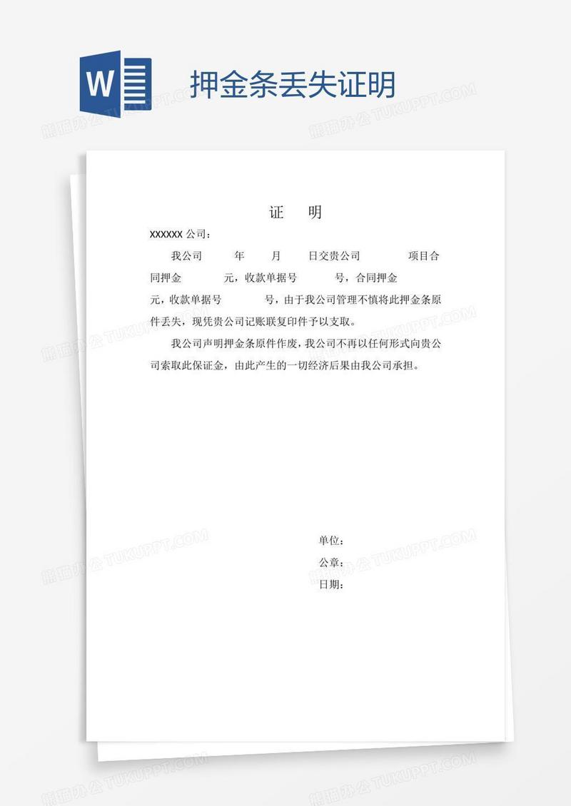 本作品为押金条丢失证明, 编号:o12ypwkkw9, 格式为 docx, 大小1 MB, 本作品下载后,先解压,解压之后用推荐软件 Word(2010) 打开, 然后进行编辑功能。