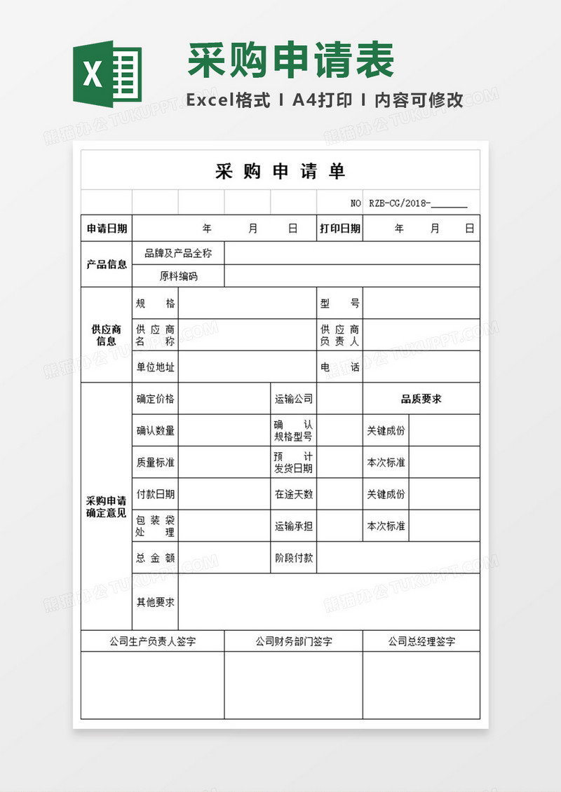 本作品为采购申请表EXCEL表模板, 编号:o12ypyd649, 格式为 xlsx, 大小1 MB, 本作品下载后,先解压,解压之后用推荐软件 Excel(2016) 打开, 然后进行编辑功能。