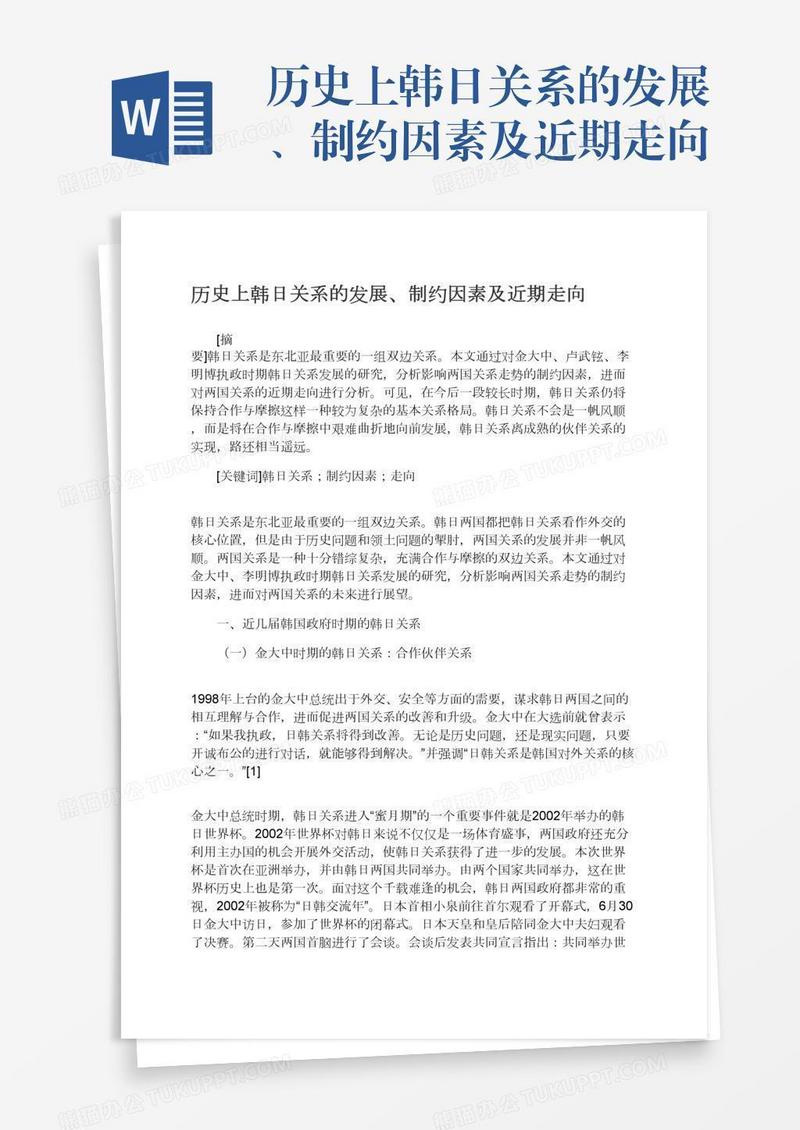 本作品为历史上韩日关系的发展、制约因素及近期走向, 编号:q1ow35d5v9, 格式为 docx, 大小1 MB, 本作品下载后,先解压,解压之后用推荐软件 Word(2010) 打开, 然后进行编辑功能。