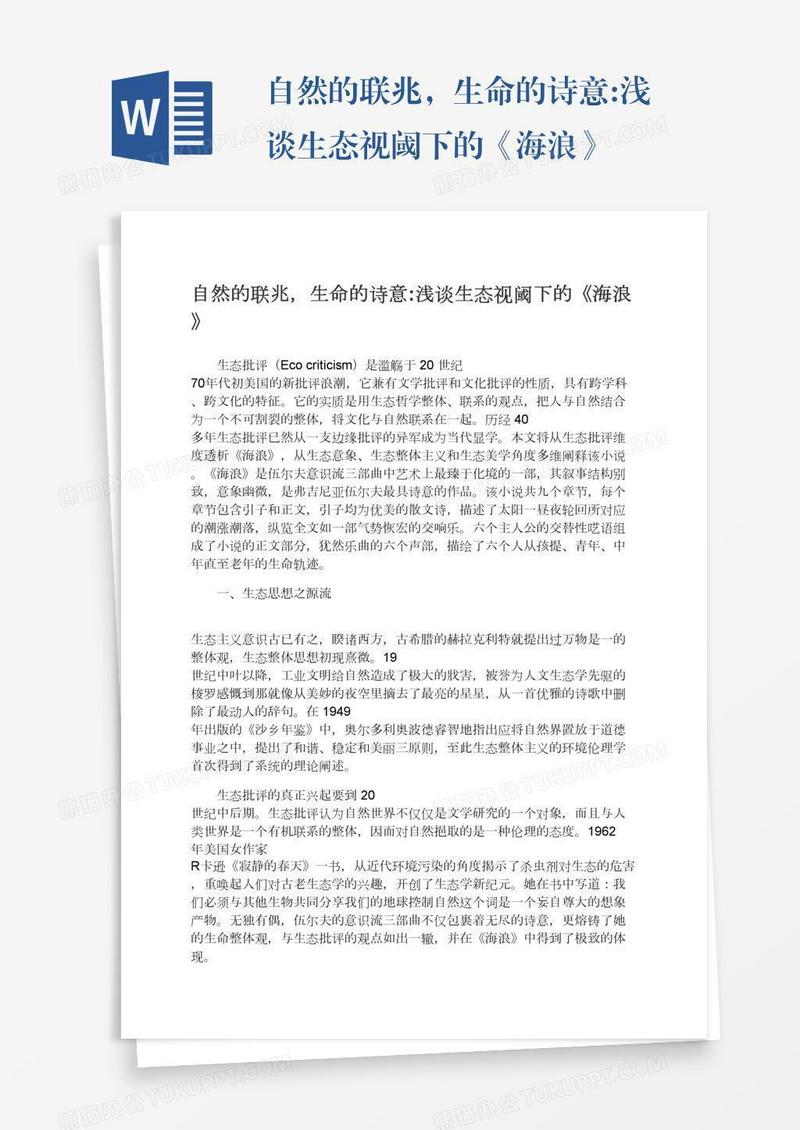 本作品为自然的联兆,生命的诗意:浅谈生态视阈下的《海浪》, 编号:q1ow3j0ep9, 格式为 docx, 大小1 MB, 本作品下载后,先解压,解压之后用推荐软件 Word(2010) 打开, 然后进行编辑功能。