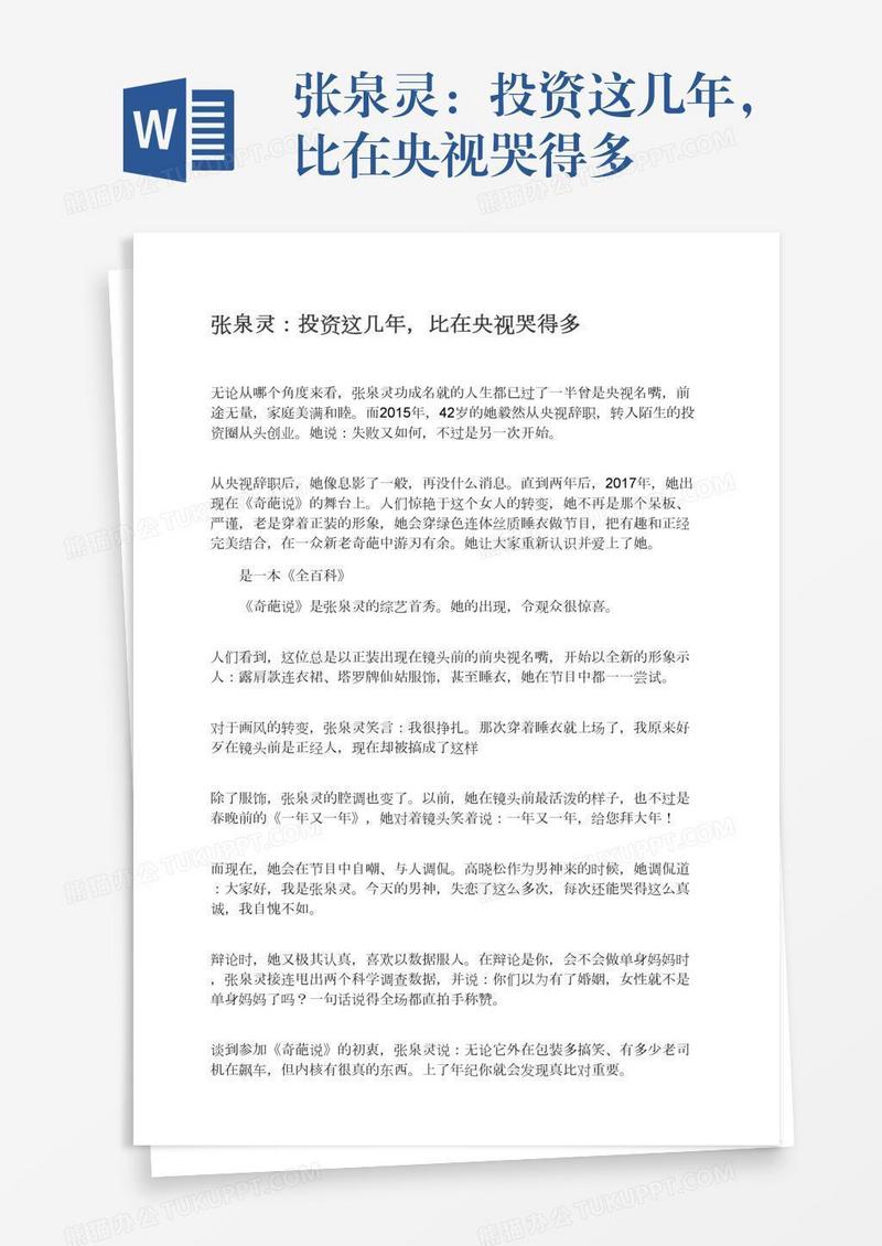 本作品为张泉灵:投资这几年,比在央视哭得多, 编号:q1ow3je2y9, 格式为 docx, 大小1 MB, 本作品下载后,先解压,解压之后用推荐软件 Word(2010) 打开, 然后进行编辑功能。