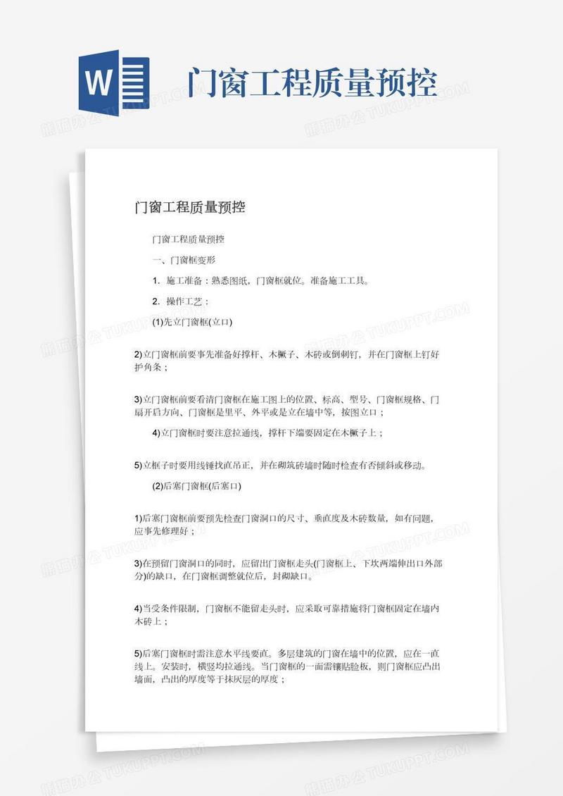 本作品为门窗工程质量预控, 编号:q1ow3jwry9, 格式为 docx, 大小1 MB, 本作品下载后,先解压,解压之后用推荐软件 Word(2010) 打开, 然后进行编辑功能。