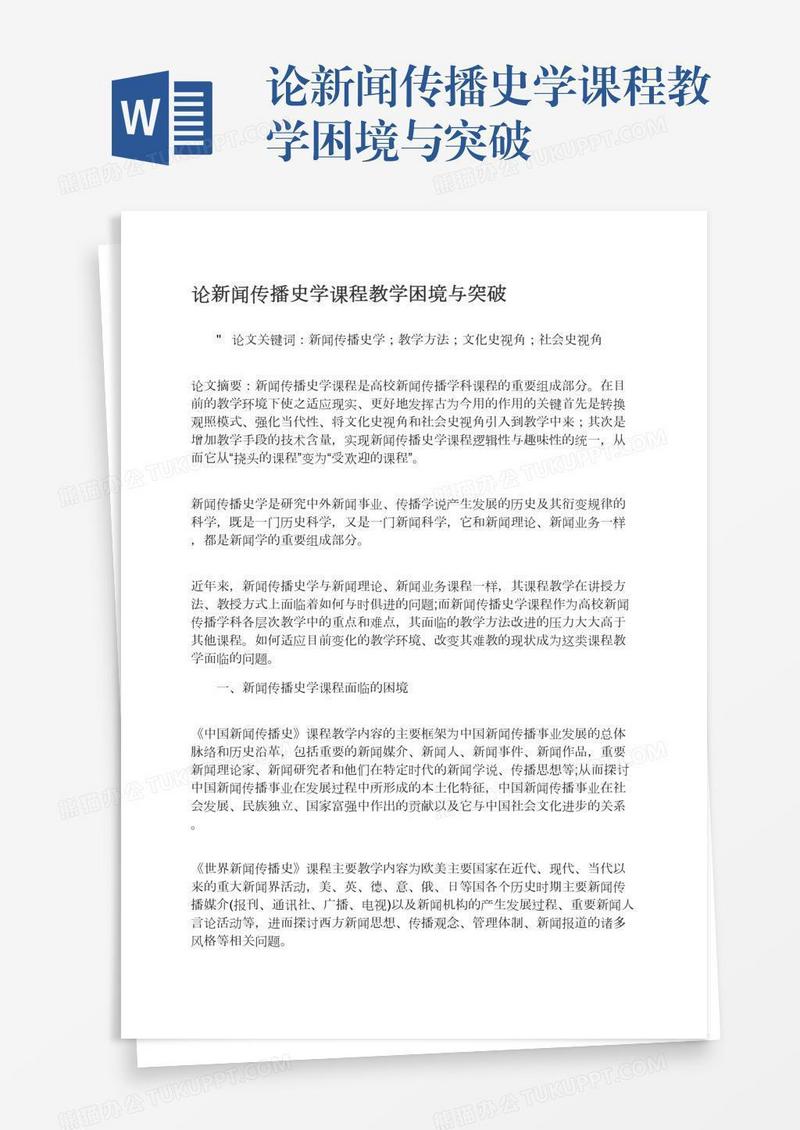 本作品为论新闻传播史学课程教学困境与突破, 编号:q1ow3meoo9, 格式为 docx, 大小1 MB, 本作品下载后,先解压,解压之后用推荐软件 Word(2010) 打开, 然后进行编辑功能。