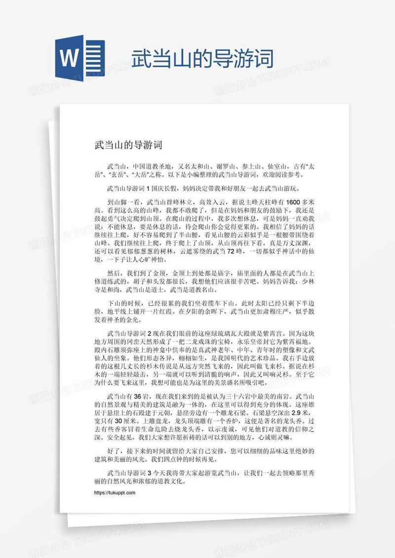 本作品为武当山的导游词, 编号:q1owj5bvv9, 格式为 docx, 大小1 MB, 本作品下载后,先解压,解压之后用推荐软件 Word(2010) 打开, 然后进行编辑功能。