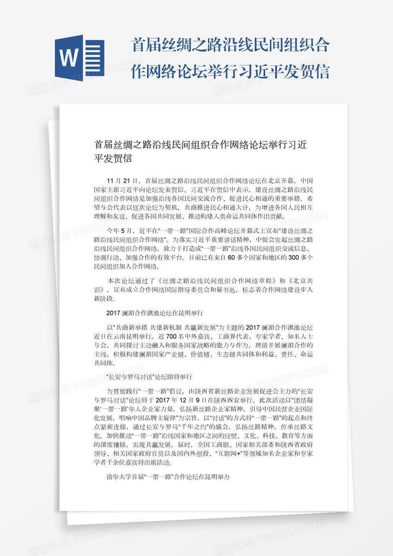 本作品为首届丝绸之路沿线民间组织合作网络论坛举行习近平发贺信, 编号:q1owj62ep9, 格式为 docx, 大小1 MB, 本作品下载后,先解压,解压之后用推荐软件 Word(2010) 打开, 然后进行编辑功能。