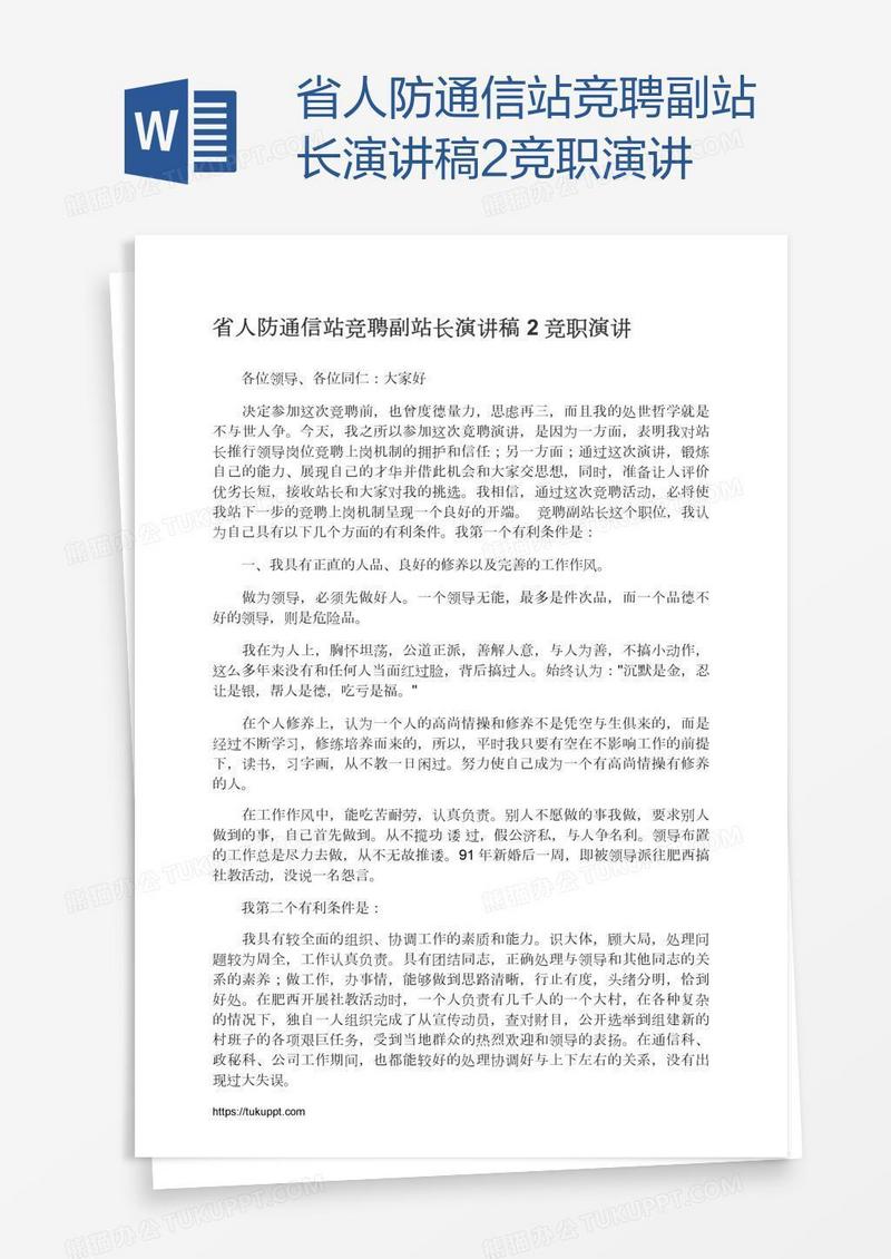 本作品为省人防通信站竞聘副站长演讲稿2竞职演讲, 编号:q1owj733n9, 格式为 docx, 大小1 MB, 本作品下载后,先解压,解压之后用推荐软件 Word(2010) 打开, 然后进行编辑功能。