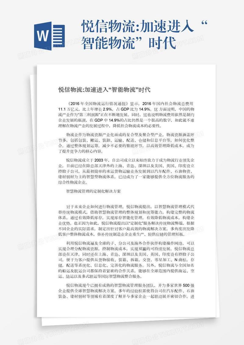 本作品为悦信物流:加速进入“智能物流”时代, 编号:q1owj7dkv9, 格式为 docx, 大小1 MB, 本作品下载后,先解压,解压之后用推荐软件 Word(2010) 打开, 然后进行编辑功能。