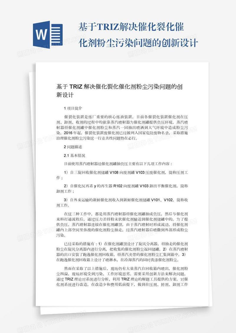 本作品为基于TRIZ解决催化裂化催化剂粉尘污染问题的创新设计, 编号:q1owj7dln9, 格式为 docx, 大小1 MB, 本作品下载后,先解压,解压之后用推荐软件 Word(2010) 打开, 然后进行编辑功能。