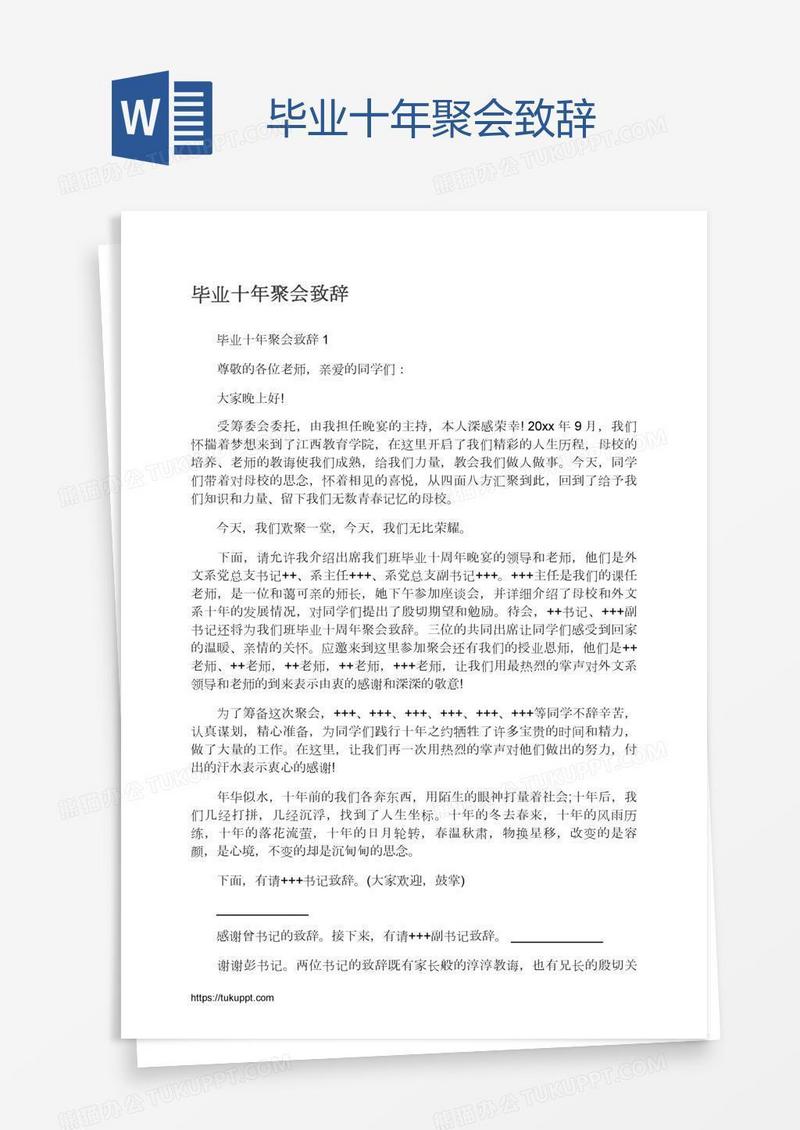 本作品为毕业十年聚会致辞, 编号:q1owjg3wl9, 格式为 docx, 大小1 MB, 本作品下载后,先解压,解压之后用推荐软件 Word(2010) 打开, 然后进行编辑功能。