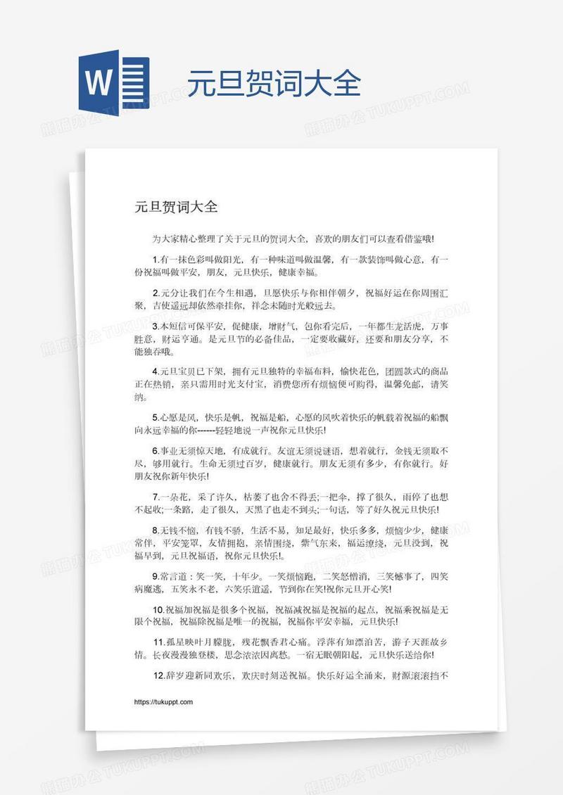 本作品为元旦贺词大全, 编号:q1owjg44o9, 格式为 docx, 大小1 MB, 本作品下载后,先解压,解压之后用推荐软件 Word(2010) 打开, 然后进行编辑功能。