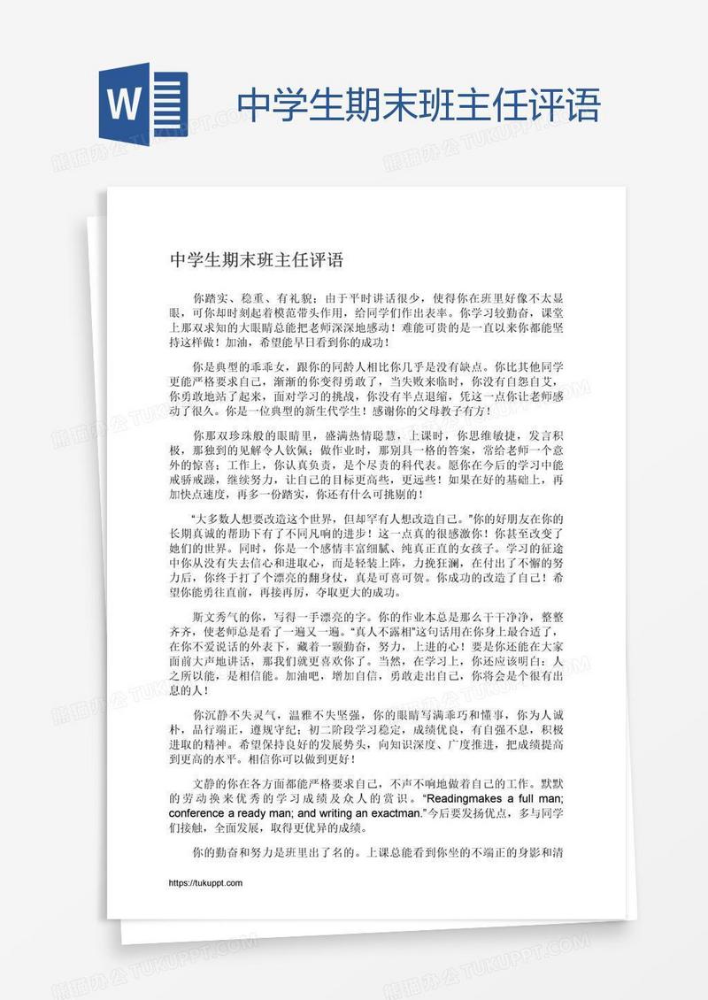本作品为中学生期末班主任评语, 编号:q1owjk27o9, 格式为 docx, 大小1 MB, 本作品下载后,先解压,解压之后用推荐软件 Word(2010) 打开, 然后进行编辑功能。