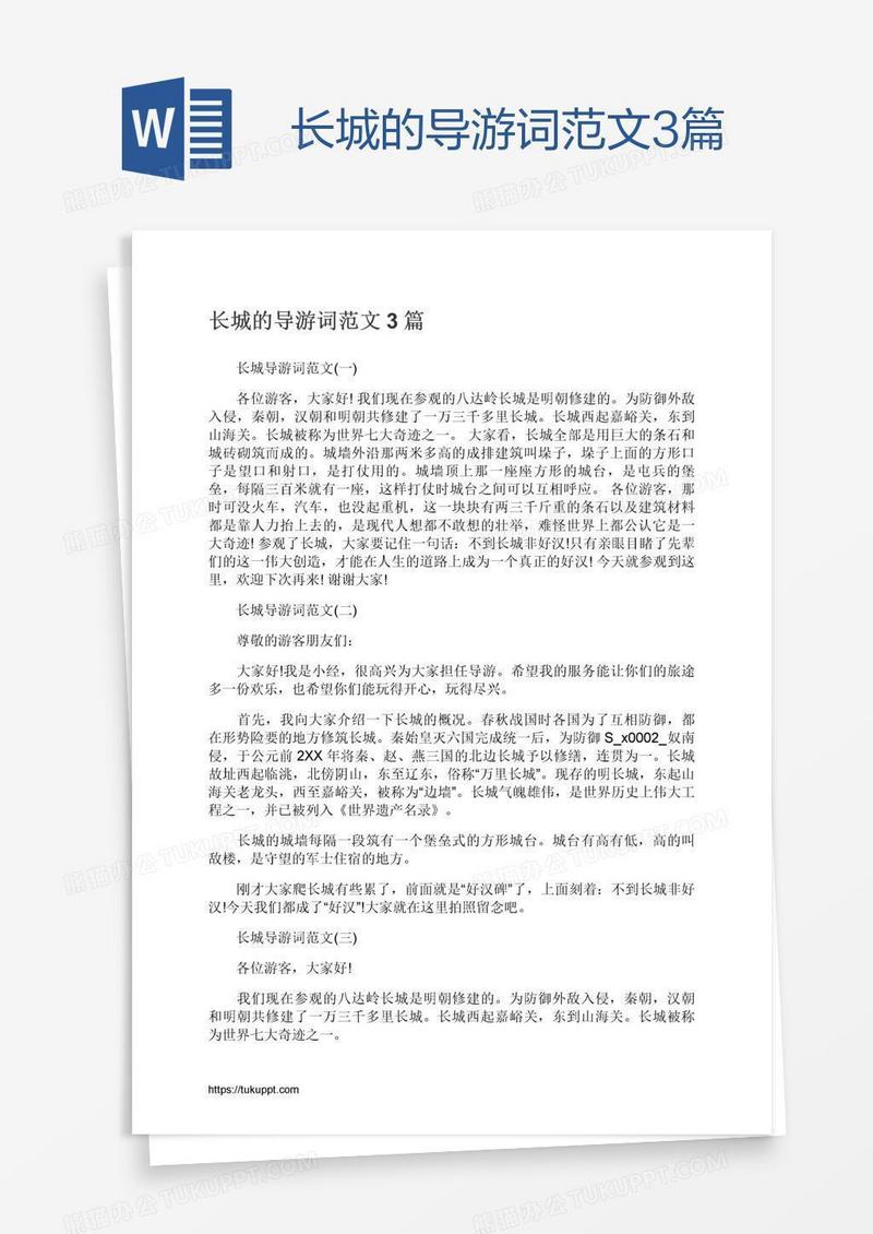 本作品为长城的导游词范文3篇, 编号:q1owjk2ln9, 格式为 docx, 大小1 MB, 本作品下载后,先解压,解压之后用推荐软件 Word(2010) 打开, 然后进行编辑功能。