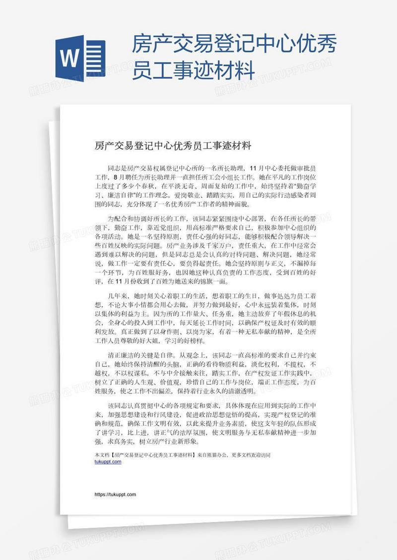 本作品为房产交易登记中心优秀员工事迹材料, 编号:q1owjkjen9, 格式为 docx, 大小1 MB, 本作品下载后,先解压,解压之后用推荐软件 Word(2010) 打开, 然后进行编辑功能。