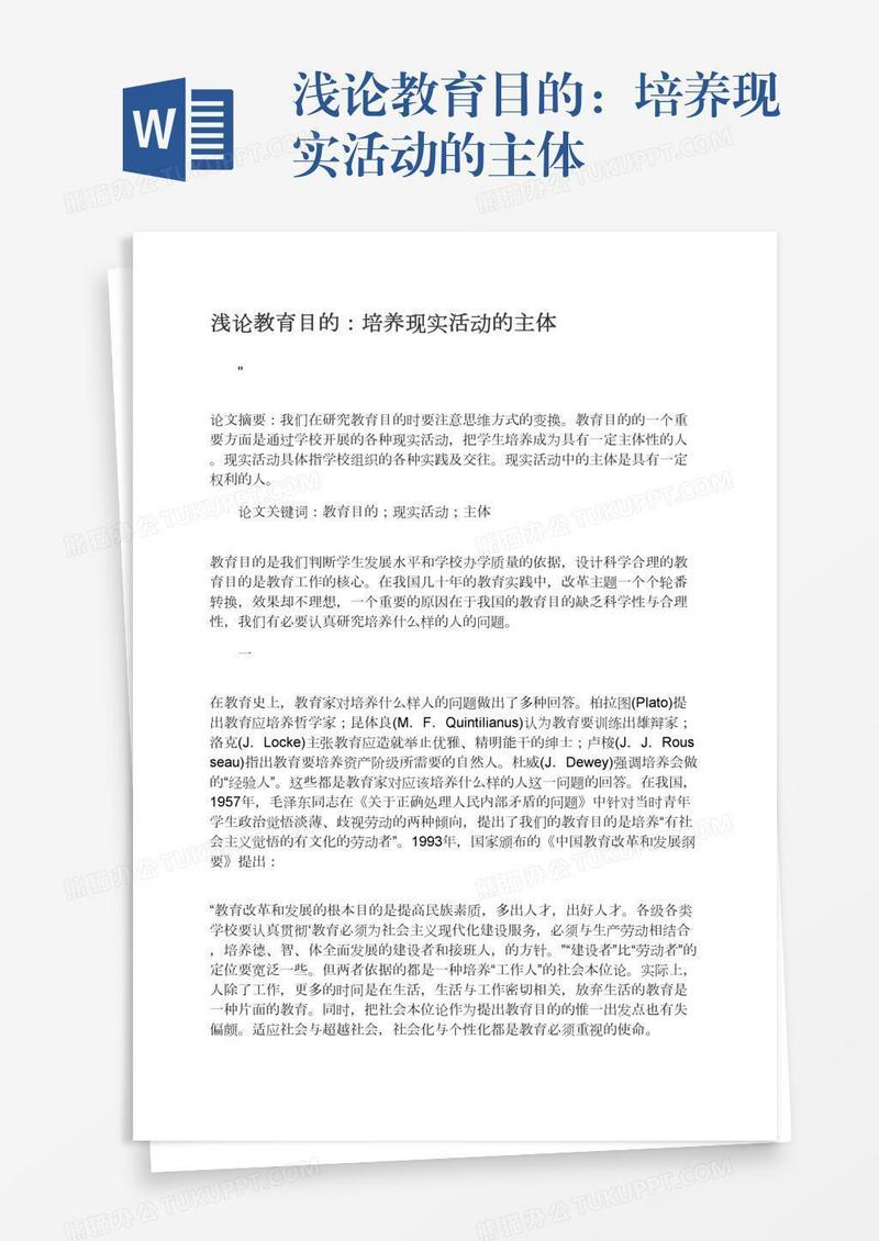 本作品为浅论教育目的:培养现实活动的主体, 编号:q1owjob5o9, 格式为 docx, 大小1 MB, 本作品下载后,先解压,解压之后用推荐软件 Word(2010) 打开, 然后进行编辑功能。