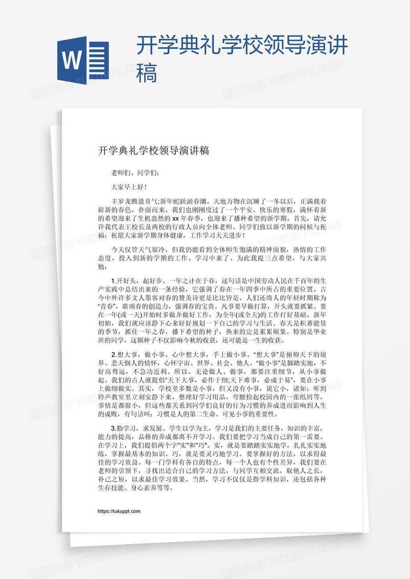 本作品为开学典礼学校领导演讲稿, 编号:q1owjp7oo9, 格式为 docx, 大小1 MB, 本作品下载后,先解压,解压之后用推荐软件 Word(2010) 打开, 然后进行编辑功能。