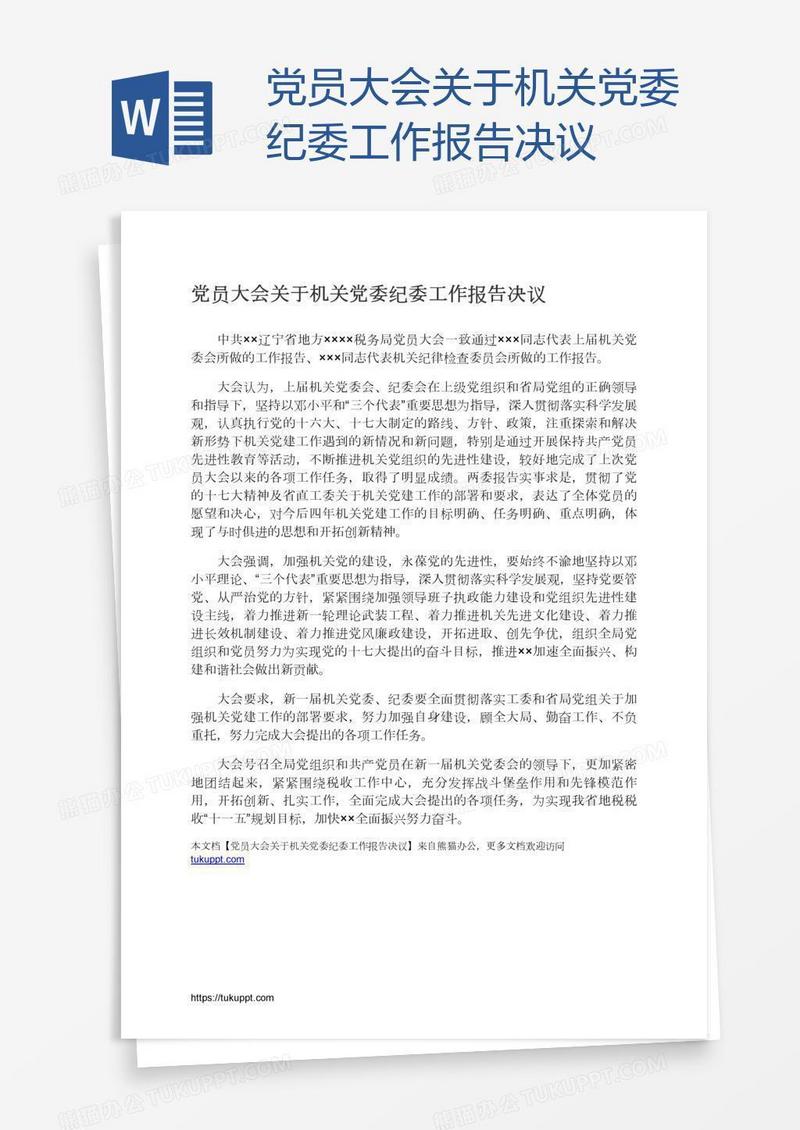本作品为党员大会关于机关党委纪委工作报告决议, 编号:q1owjpkgo9, 格式为 docx, 大小1 MB, 本作品下载后,先解压,解压之后用推荐软件 Word(2010) 打开, 然后进行编辑功能。