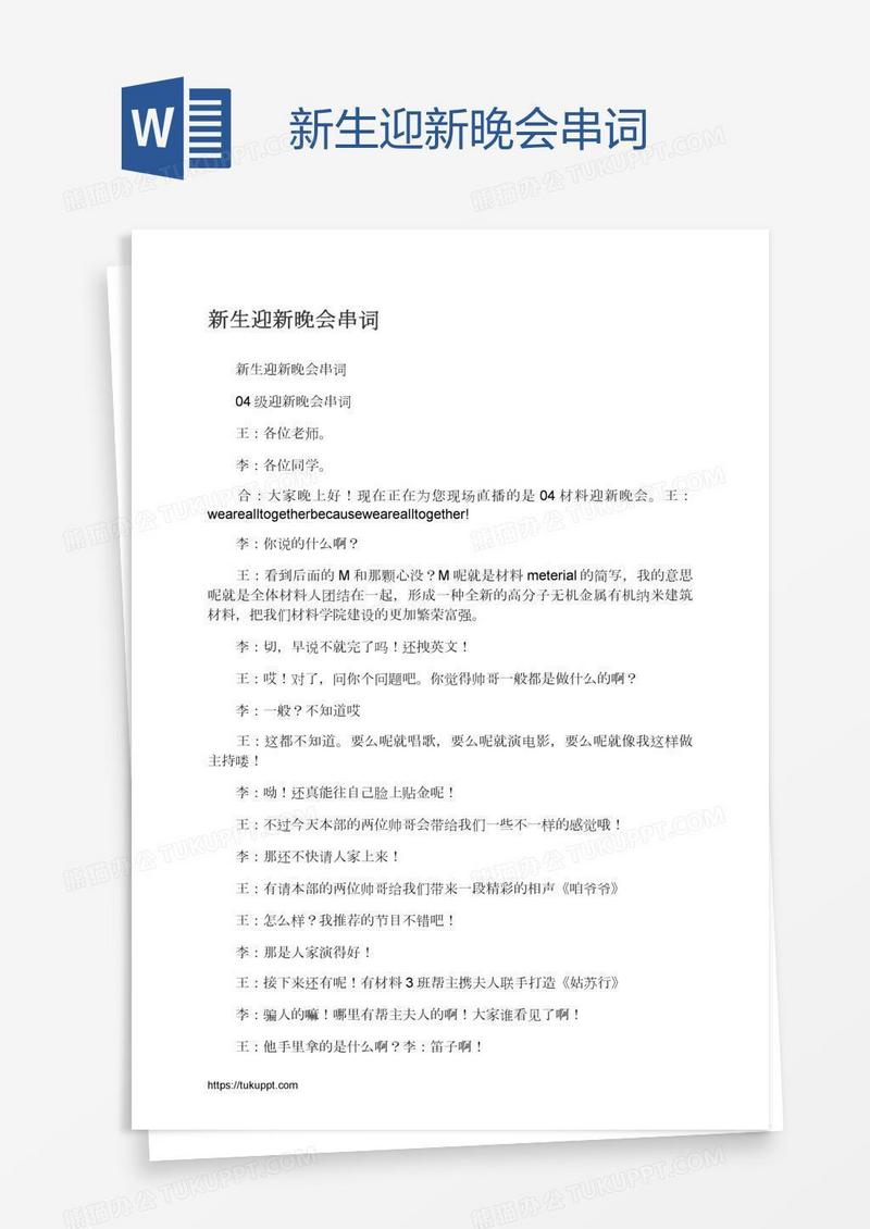 本作品为新生迎新晚会串词, 编号:q1owjvkwl9, 格式为 docx, 大小1 MB, 本作品下载后,先解压,解压之后用推荐软件 Word(2010) 打开, 然后进行编辑功能。