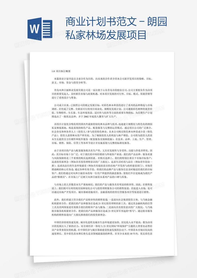 本作品为商业计划书范文-朗园私家林场发展项目, 编号:q1ownvdrp9, 格式为 doc, 大小1 MB, 本作品下载后,先解压,解压之后用推荐软件 Word(2010) 打开, 然后进行编辑功能。