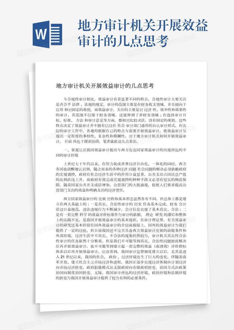 本作品为地方审计机关开展效益审计的几点思考, 编号:r1p3b0rw09, 格式为 docx, 大小1 MB, 本作品下载后,先解压,解压之后用推荐软件 Word(2010) 打开, 然后进行编辑功能。