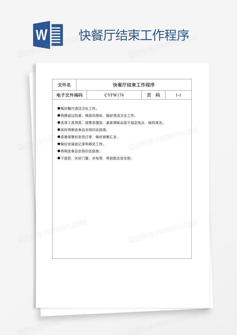 本作品为快餐厅结束工作程序, 编号:r1p3b6bj09, 格式为 docx, 大小1 MB, 本作品下载后,先解压,解压之后用推荐软件 Word(2010) 打开, 然后进行编辑功能。