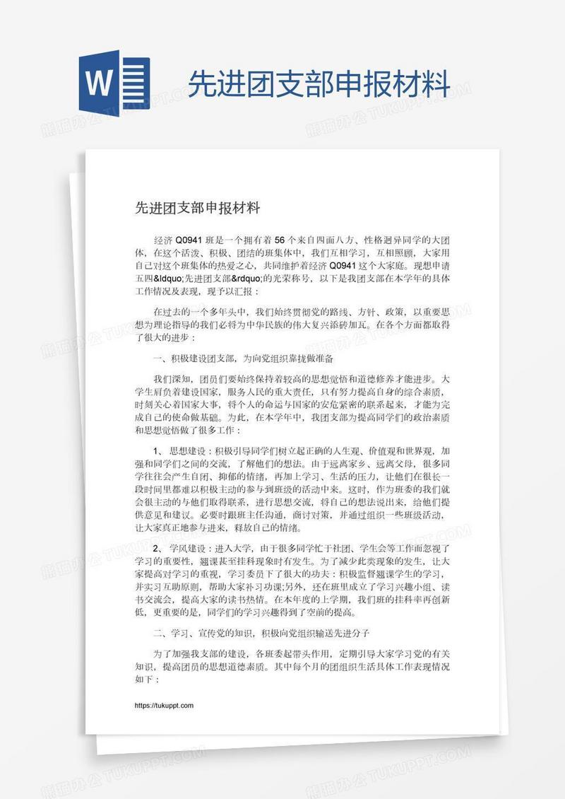 本作品为先进团支部申报材料, 编号:r1p3b78409, 格式为 docx, 大小1 MB, 本作品下载后,先解压,解压之后用推荐软件 Word(2010) 打开, 然后进行编辑功能。