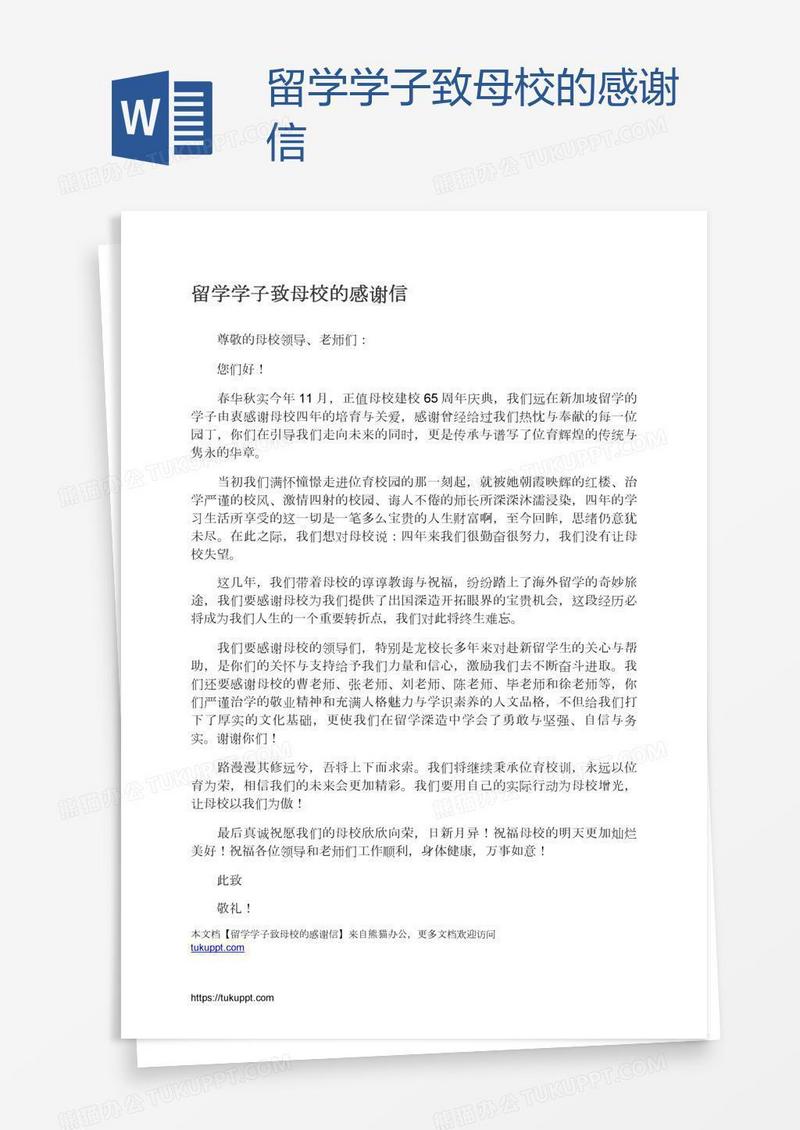 本作品为留学学子致母校的感谢信, 编号:r1p3bg0009, 格式为 docx, 大小1 MB, 本作品下载后,先解压,解压之后用推荐软件 Word(2010) 打开, 然后进行编辑功能。