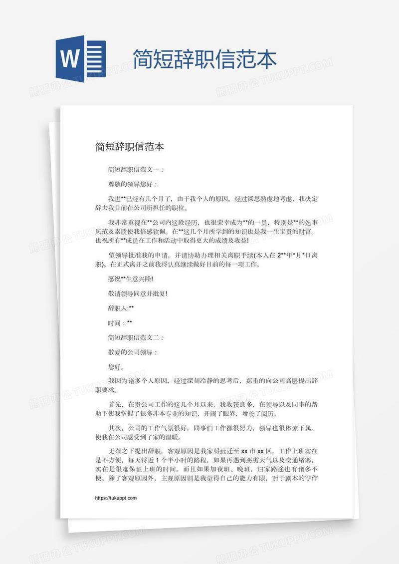 本作品为简短辞职信范本, 编号:r1p3bggky9, 格式为 docx, 大小1 MB, 本作品下载后,先解压,解压之后用推荐软件 Word(2010) 打开, 然后进行编辑功能。