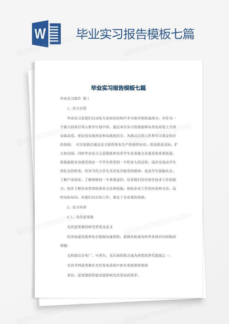 本作品为毕业实习报告模板七篇, 编号:r1p3bjmkb9, 格式为 docx, 大小1 MB, 本作品下载后,先解压,解压之后用推荐软件 Word(2010) 打开, 然后进行编辑功能。