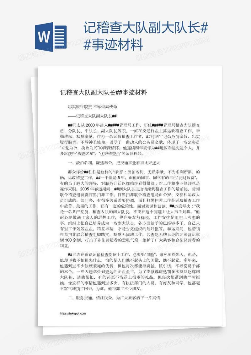 本作品为记稽查大队副大队长##事迹材料, 编号:r1p3bknby9, 格式为 docx, 大小1 MB, 本作品下载后,先解压,解压之后用推荐软件 Word(2010) 打开, 然后进行编辑功能。