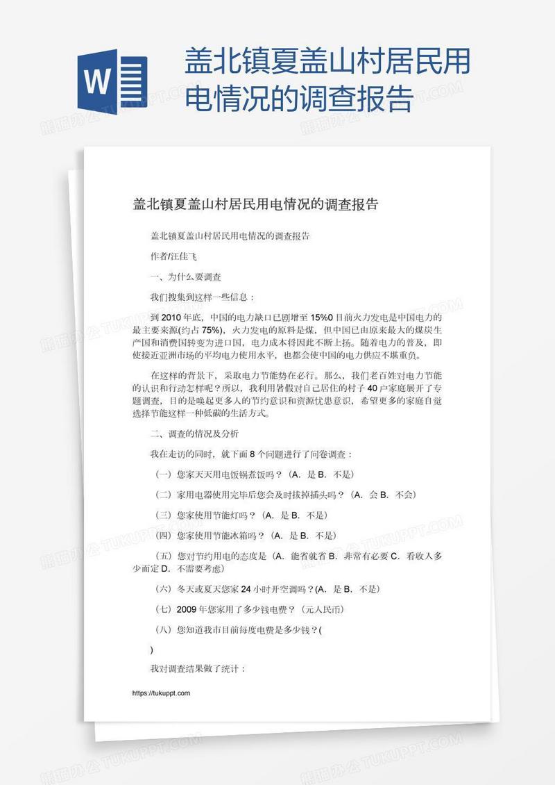 本作品为盖北镇夏盖山村居民用电情况的调查报告, 编号:r1p3bn2gb9, 格式为 docx, 大小1 MB, 本作品下载后,先解压,解压之后用推荐软件 Word(2010) 打开, 然后进行编辑功能。