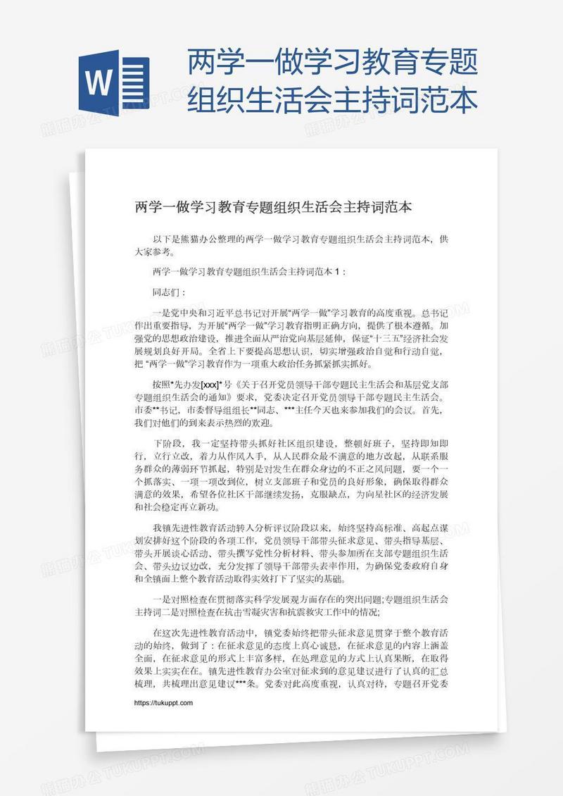 本作品为两学一做学习教育专题组织生活会主持词范本, 编号:r1p3br5gb9, 格式为 docx, 大小1 MB, 本作品下载后,先解压,解压之后用推荐软件 Word(2010) 打开, 然后进行编辑功能。