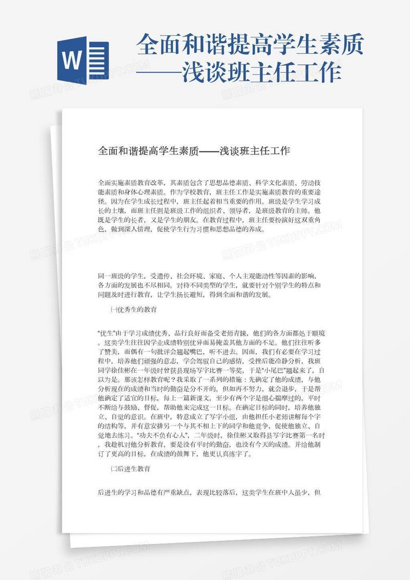 本作品为全面和谐提高学生素质——浅谈班主任工作, 编号:r1p3bw7ey9, 格式为 docx, 大小1 MB, 本作品下载后,先解压,解压之后用推荐软件 Word(2010) 打开, 然后进行编辑功能。