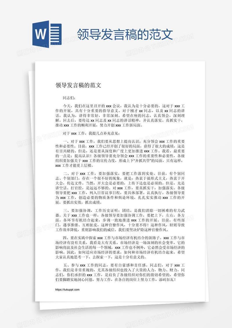 本作品为领导发言稿的范文, 编号:r1p3by47r9, 格式为 docx, 大小1 MB, 本作品下载后,先解压,解压之后用推荐软件 Word(2010) 打开, 然后进行编辑功能。