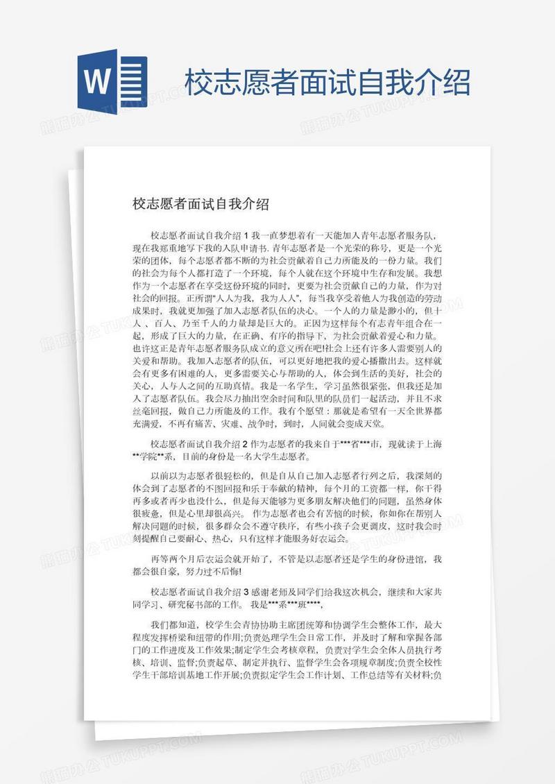 本作品为校志愿者面试自我介绍, 编号:r1p3byyqk9, 格式为 docx, 大小1 MB, 本作品下载后,先解压,解压之后用推荐软件 Word(2010) 打开, 然后进行编辑功能。