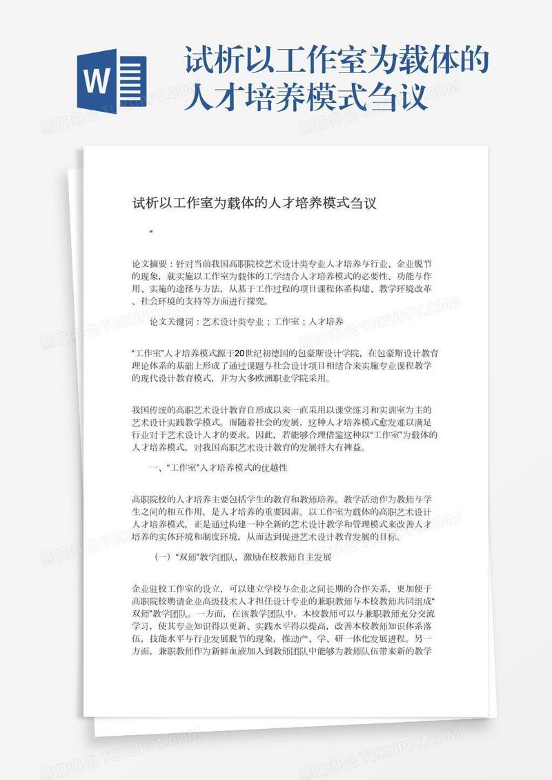 本作品为试析以工作室为载体的人才培养模式刍议, 编号:r1p3g3b8y9, 格式为 docx, 大小1 MB, 本作品下载后,先解压,解压之后用推荐软件 Word(2010) 打开, 然后进行编辑功能。