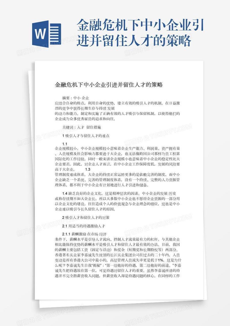 本作品为金融危机下中小企业引进并留住人才的策略, 编号:r1p3gbmvy9, 格式为 docx, 大小1 MB, 本作品下载后,先解压,解压之后用推荐软件 Word(2010) 打开, 然后进行编辑功能。