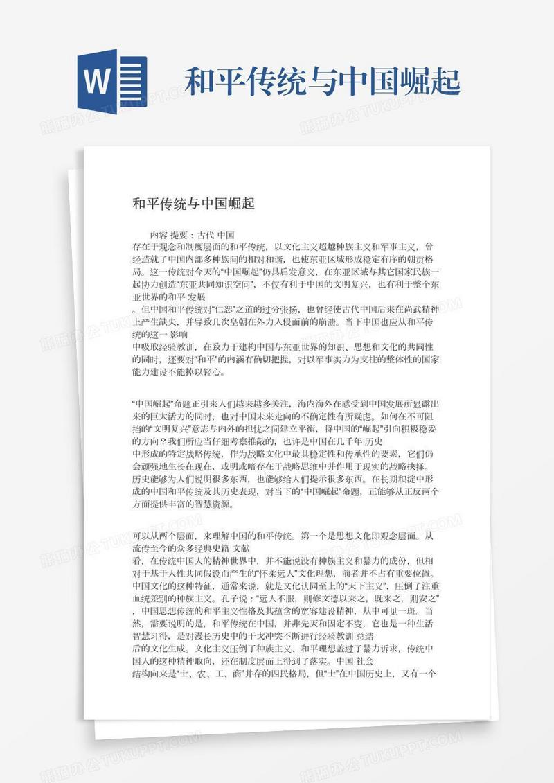 本作品为和平传统与中国崛起, 编号:r1p3gn8609, 格式为 docx, 大小1 MB, 本作品下载后,先解压,解压之后用推荐软件 Word(2010) 打开, 然后进行编辑功能。
