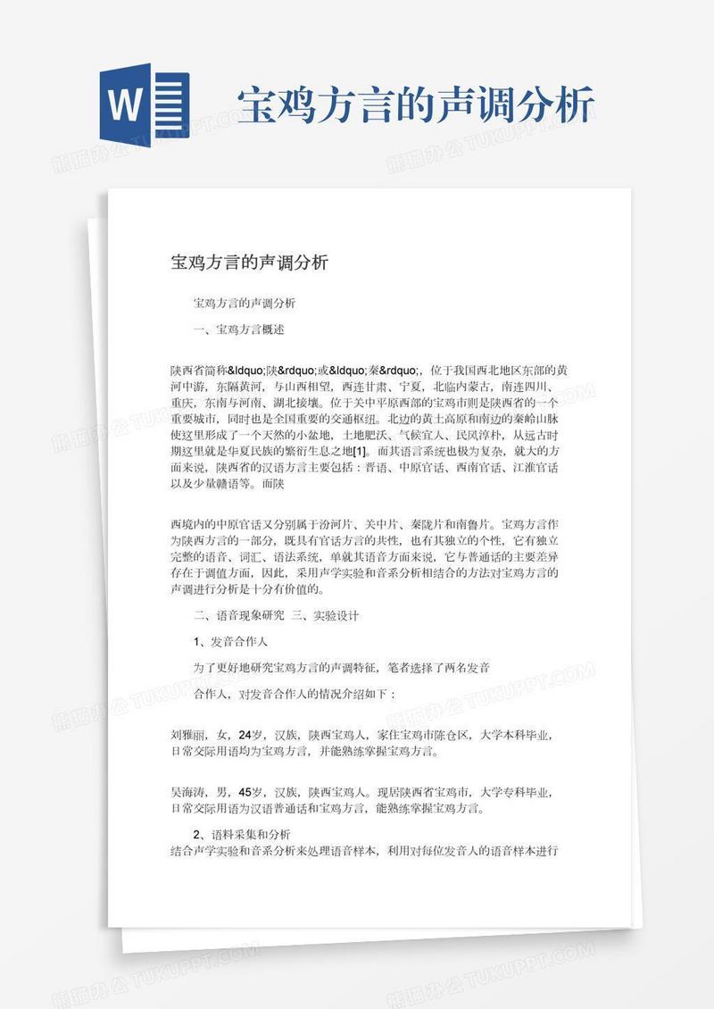 本作品为宝鸡方言的声调分析, 编号:r1p3gy7yb9, 格式为 docx, 大小1 MB, 本作品下载后,先解压,解压之后用推荐软件 Word(2010) 打开, 然后进行编辑功能。