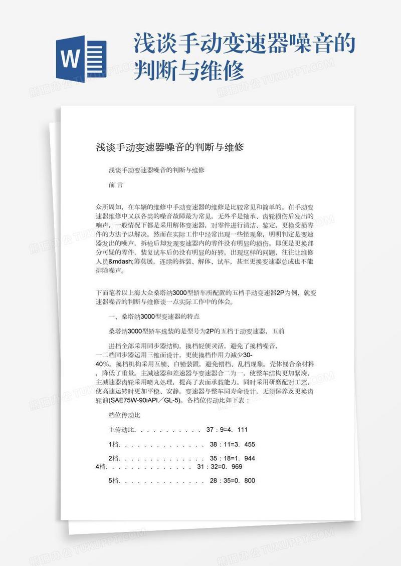 本作品为浅谈手动变速器噪音的判断与维修, 编号:r1p3gykbr9, 格式为 docx, 大小1 MB, 本作品下载后,先解压,解压之后用推荐软件 Word(2010) 打开, 然后进行编辑功能。