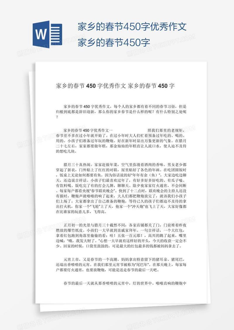 本作品为家乡的春节450字优秀作文家乡的春节450字, 编号:r1p3n66vk9, 格式为 docx, 大小1 MB, 本作品下载后,先解压,解压之后用推荐软件 Word(2010) 打开, 然后进行编辑功能。