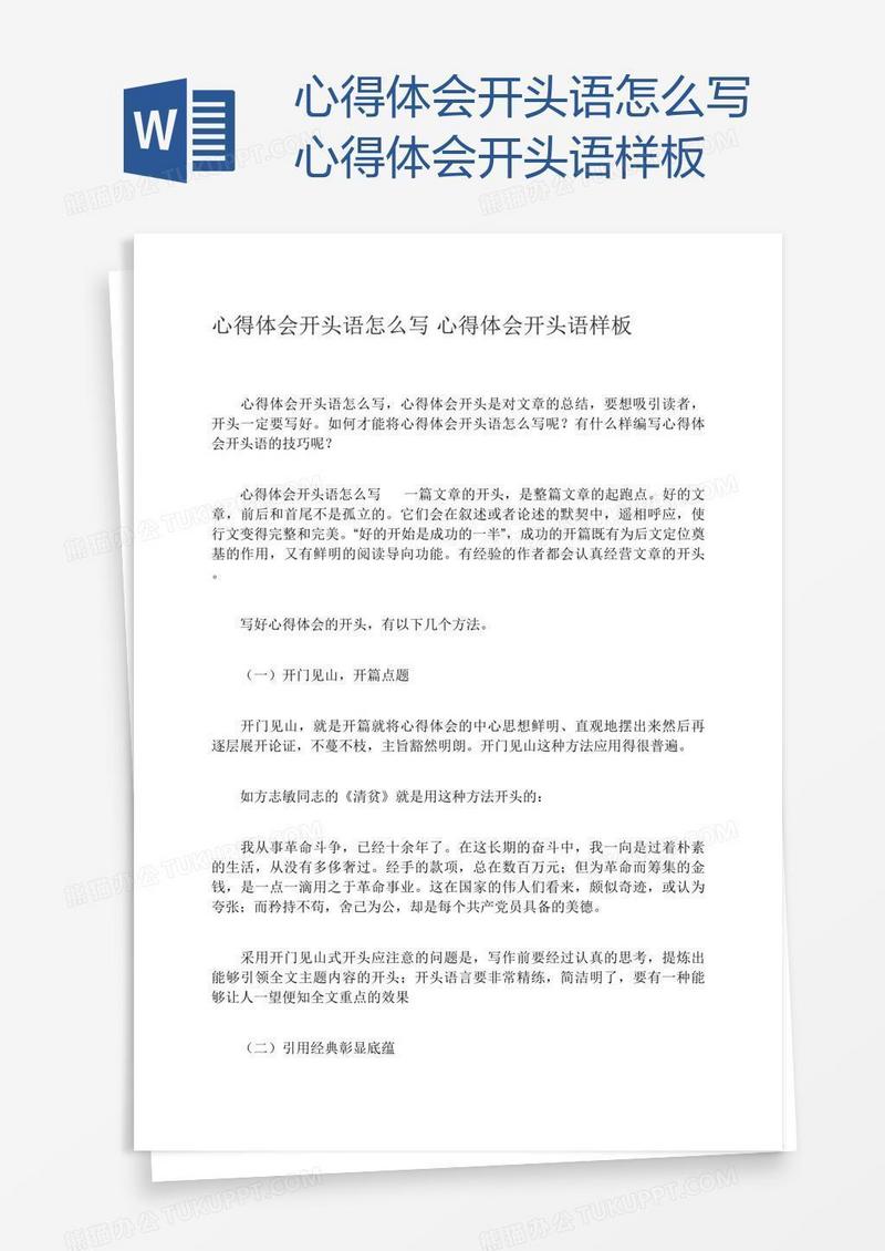 本作品为怎么写心得体会开头语样板, 编号:r1p3n6w2b9, 格式为 docx, 大小1 MB, 本作品下载后,先解压,解压之后用推荐软件 Word(2010) 打开, 然后进行编辑功能。