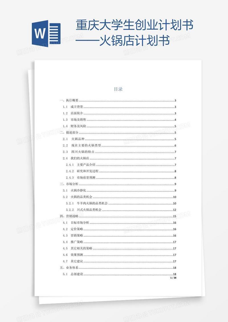 本作品为重庆大学生创业计划书——火锅店计划书, 编号:r1p3n82k09, 格式为 doc, 大小1 MB, 本作品下载后,先解压,解压之后用推荐软件 Word(2010) 打开, 然后进行编辑功能。