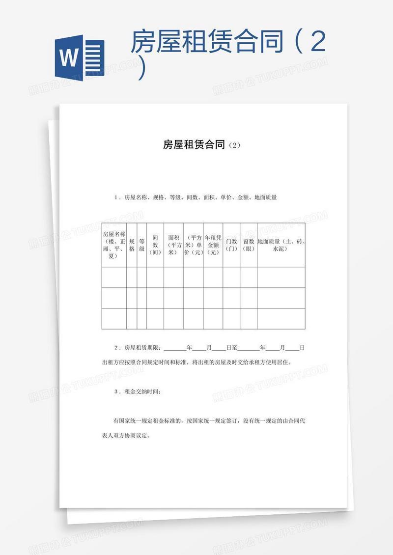 本作品为房屋租赁合同(2), 编号:r1p3nj6nv9, 格式为 doc, 大小1 MB, 本作品下载后,先解压,解压之后用推荐软件 Word(2010) 打开, 然后进行编辑功能。