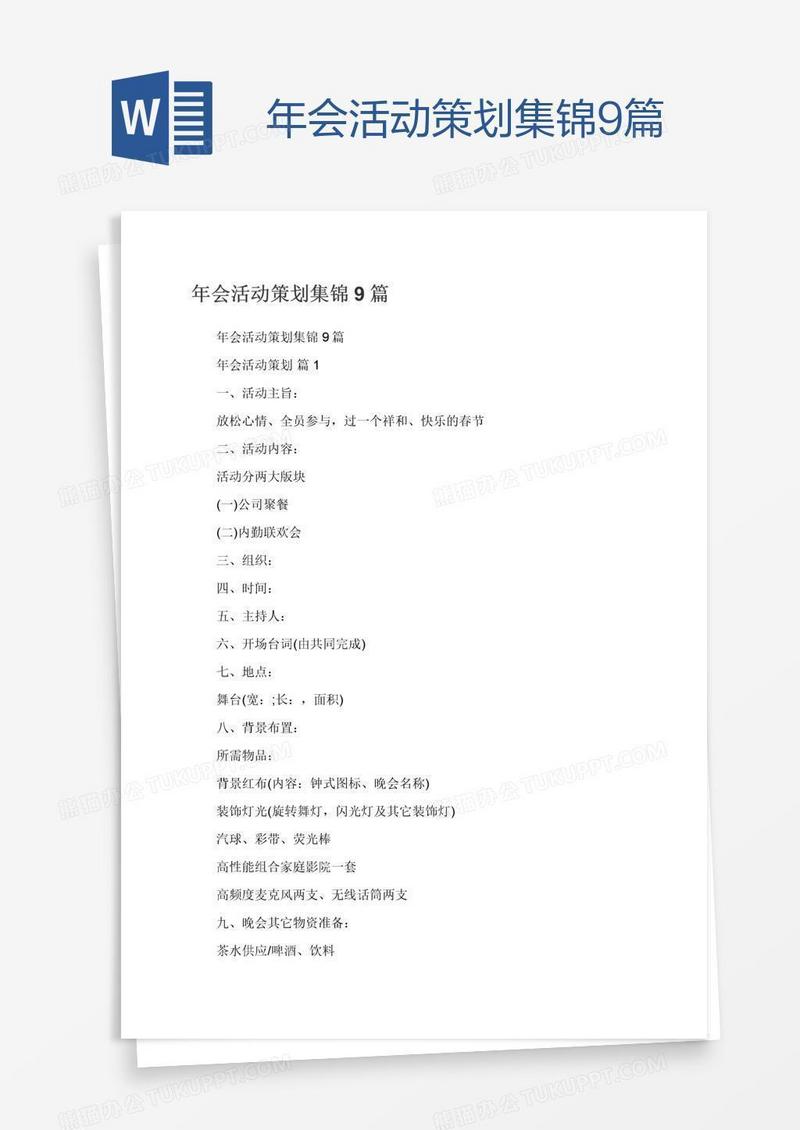 本作品为年会活动策划集锦9篇, 编号:r1p3nopyk9, 格式为 docx, 大小1 MB, 本作品下载后,先解压,解压之后用推荐软件 Word(2010) 打开, 然后进行编辑功能。