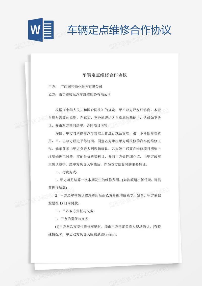 本作品为车辆定点维修合作协议, 编号:r1p3nv3809, 格式为 doc, 大小1 MB, 本作品下载后,先解压,解压之后用推荐软件 Word(2010) 打开, 然后进行编辑功能。