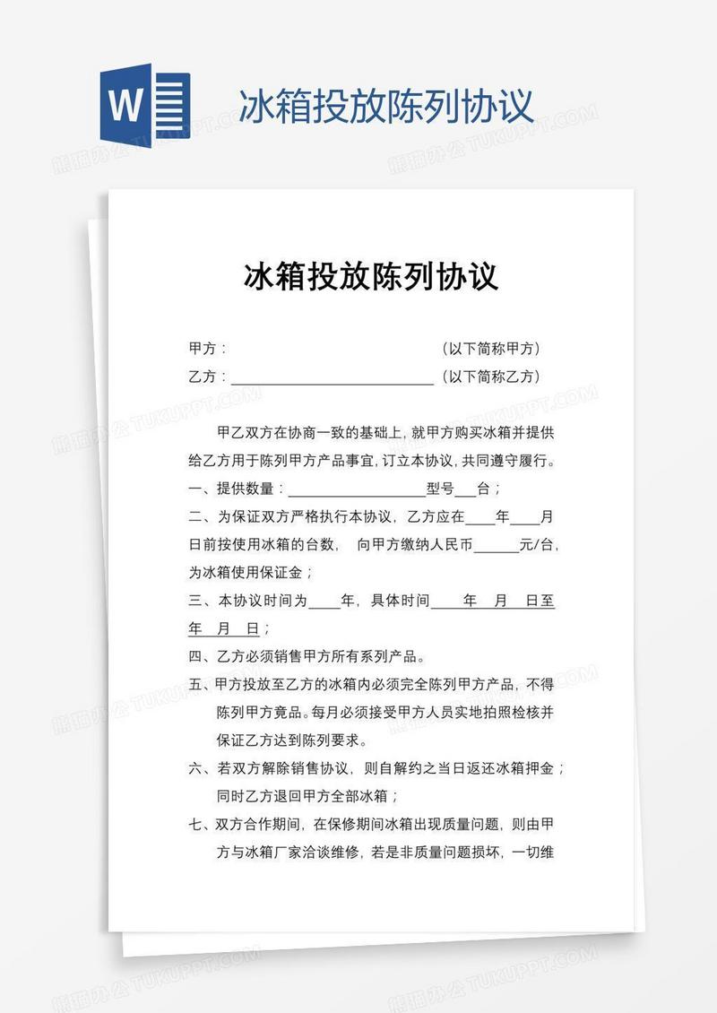 本作品为冰箱投放陈列协议, 编号:r1p3nv3j09, 格式为 doc, 大小1 MB, 本作品下载后,先解压,解压之后用推荐软件 Word(2010) 打开, 然后进行编辑功能。