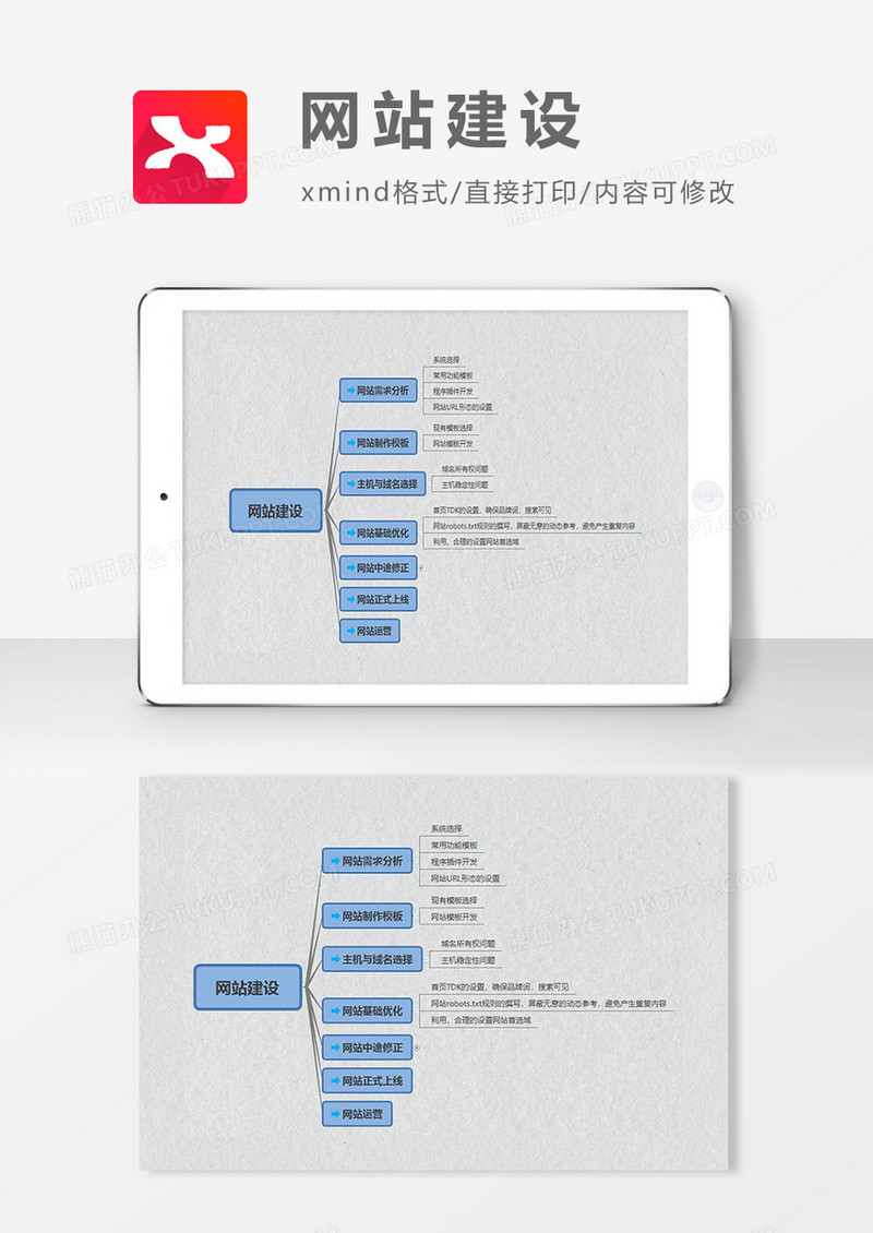 本作品为思维导图简洁灰色网站建设XMind模板, 编号:v9lw2jmk3a, 格式为 XMind, 大小3 MB, 本作品下载后,先解压,解压之后用推荐软件 XMind(XMind8) 打开, 然后进行编辑功能。
