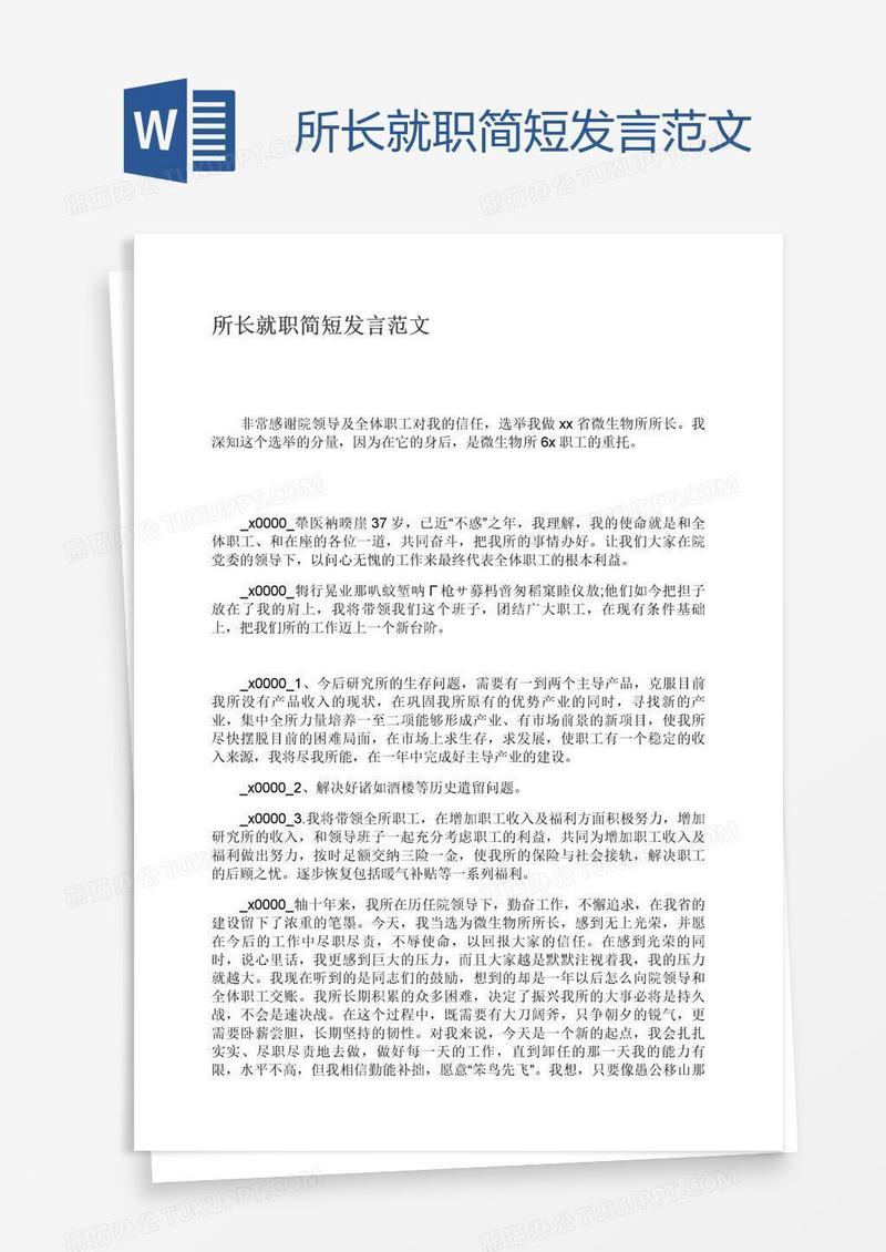 本作品为所长就职简短发言范文, 编号:v9lw2ljmya, 格式为 docx, 大小1 MB, 本作品下载后,先解压,解压之后用推荐软件 Word(2010) 打开, 然后进行编辑功能。
